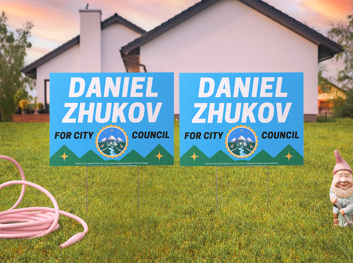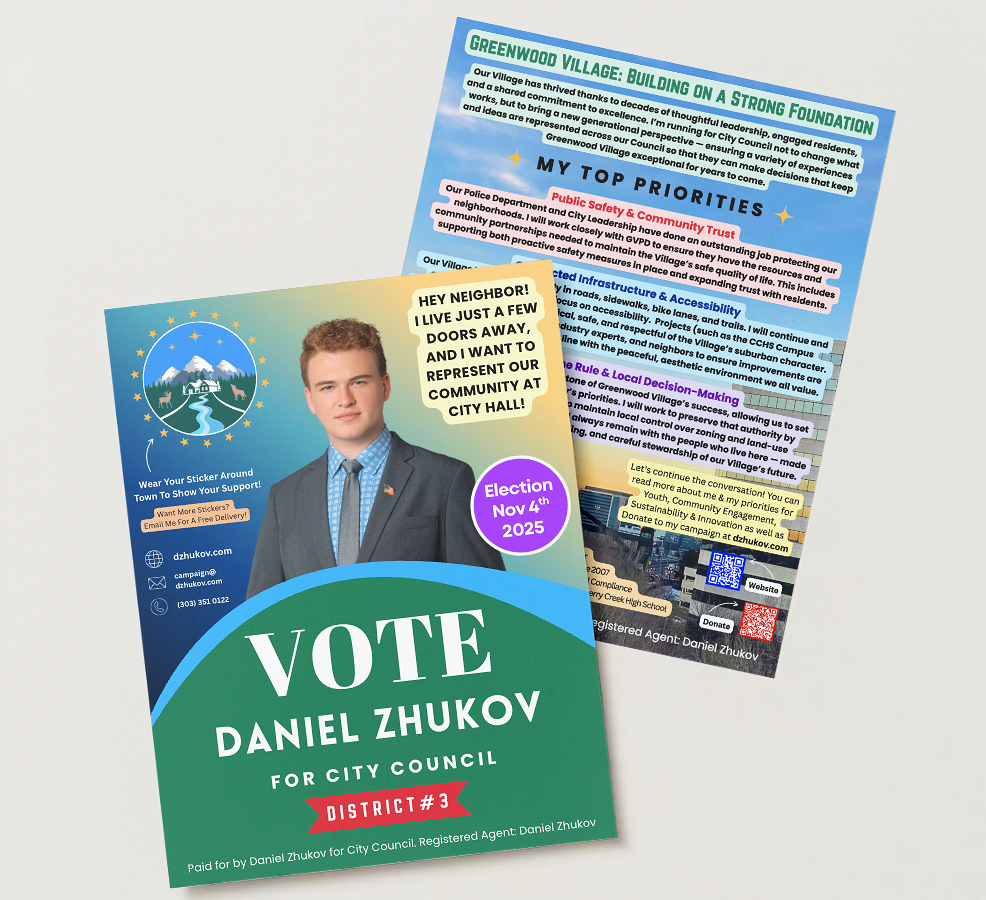 Keep an eye out for the official Daniel Zhukov for Greenwood Village City Council logo β itβs the mark of a campaign grounded in Colorado's natural beauty. Youβll see it on flyers, yard signs, brochures, and across social media. When you rock the logo, youβre showing support for a fresh perspective and a better future for our Village. Whether itβs a sticker on your laptop, a sign in your yard, or a pin on your jacket β every display helps spread the message: Putting Neighbors First!